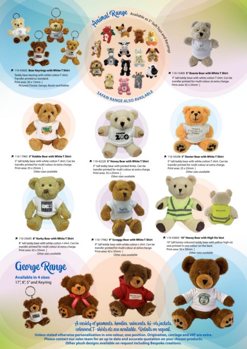 110-35695 8'' Korky Bear with White T Shirt 110-17962 9'' Scraggy Bear with White T Shirt 110-43603 10" Honey Bear with High Viz Vest