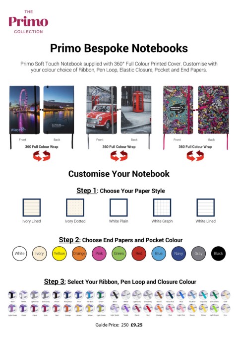 Primo Soft Touch Notebook supplied with 360° Full Colour Printed Cover. Customise with